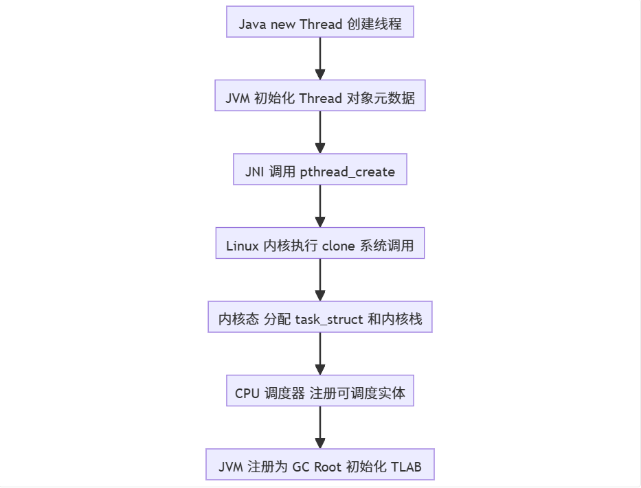 其中,真正的 “重量级” 开销集中在pthread_create之后的步骤—— 线程本质是 “Java 封装的 OS 调度实体”,而非单纯的语言级对象。这意味着:创建线程不仅是 JVM 堆中分配一个对象,更是向操作系统 “申请调度资源” 的过程。