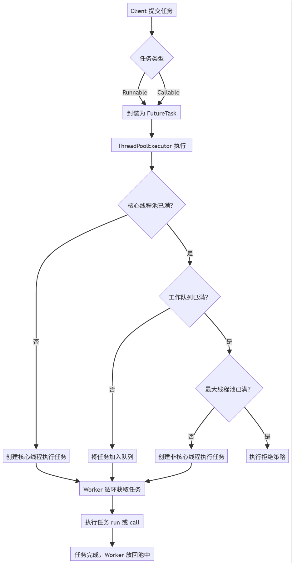 Java 中的 ThreadPoolExecutor 是线程池设计的经典实现,其核心组件与执行链路可通过以下流程图理解: