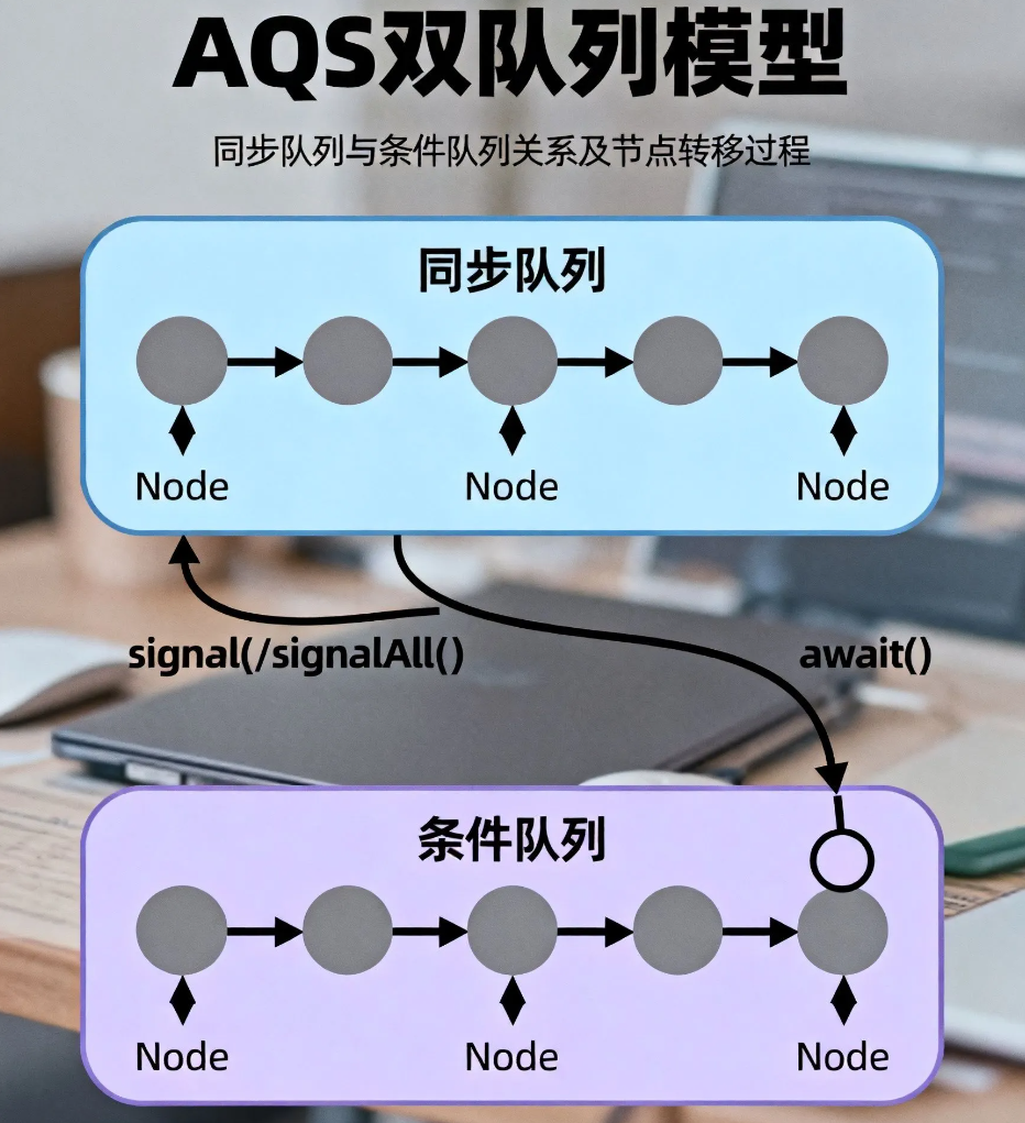 - 状态转换:释放锁 → 进入条件队列 → 被唤醒后转移至同步队列