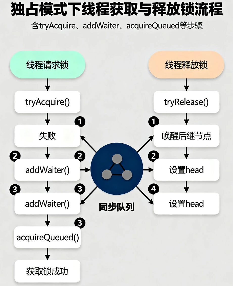 AQS 独占模式的核心交互围绕状态获取与释放机制展开,其设计通过分层逻辑实现高效资源竞争处理。获取流程采用”短路逻辑”优化:首先调用 tryAcquire(int arg) 尝试直接获取资源,成功则立即返回;失败才执行后续的入队阻塞流程。这种设计减少了不必要的队列操作开销,是 AQS 性能优化的关键一环。